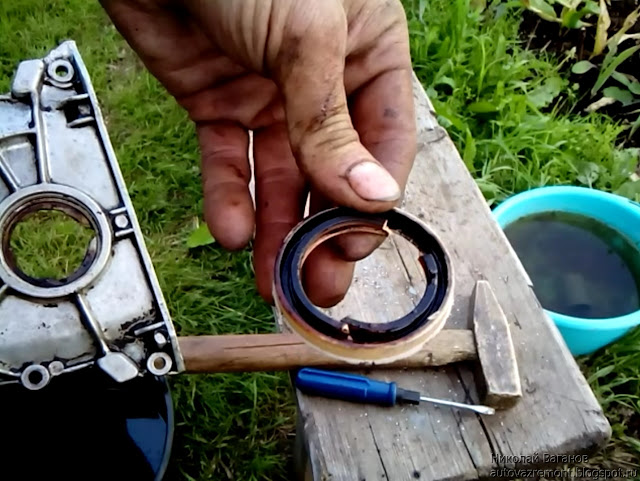 Для начала, заменим сальник коленчатого вала в передней крышке — за годы работы резина задубела и начало выдавливать масло.