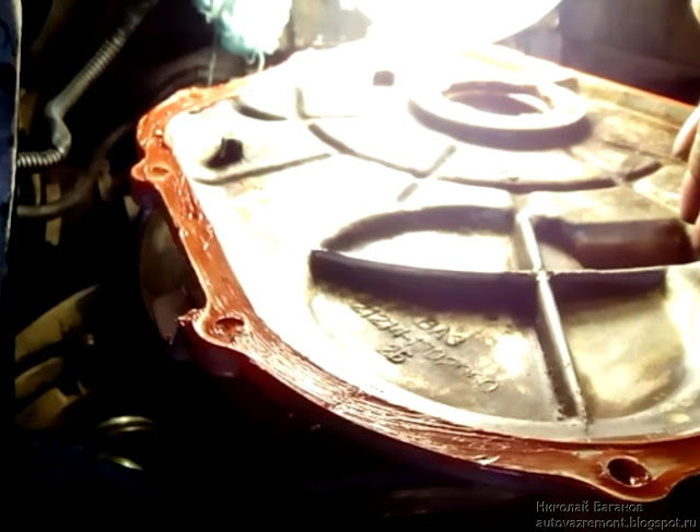 Затяжку начинаем с лицевой стороны в несколько приемов крест-накрест, только затем заворачиваем оставшиеся 3 болта крепления поддона снизу, чтобы не нарушить центровку сальника на валу и не допустить течи. Бумажную прокладку можно смазать с обеих сторон тонким слоем герметика, масла или посадить только на герметик, главное, чтобы его частицы не попали в двигатель.